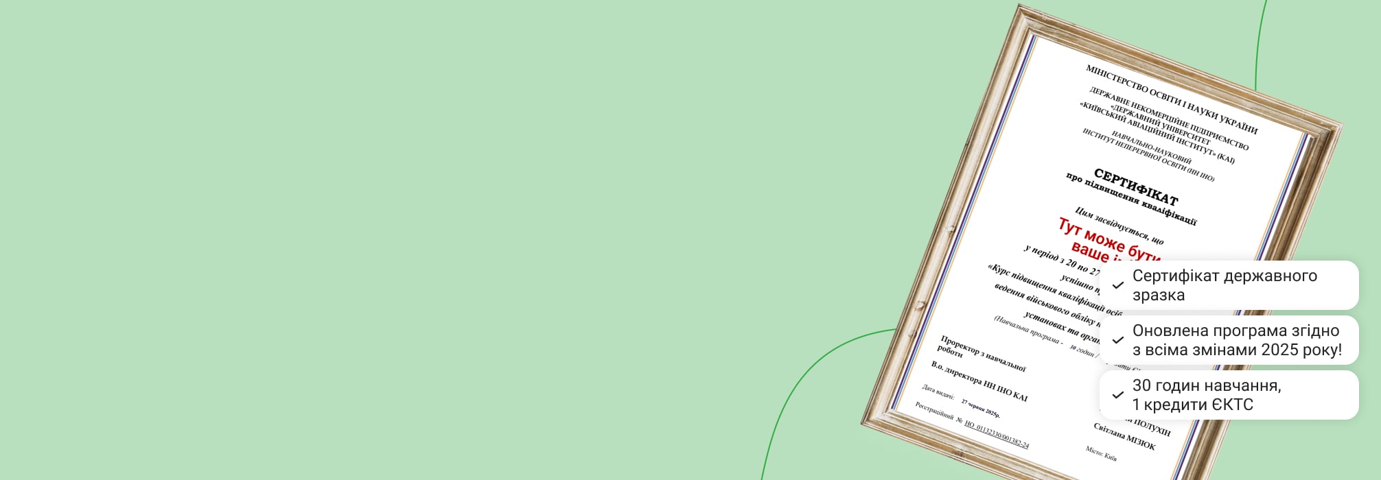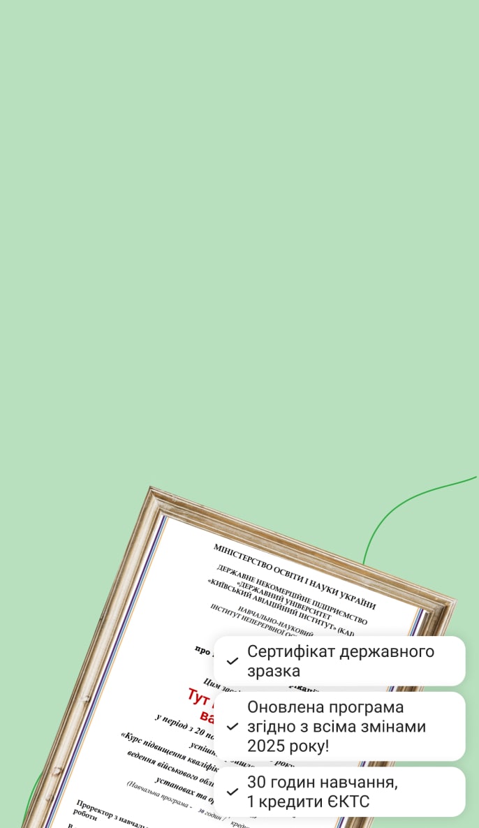 НовеСертифікат державного зразка від КАІ про завершення навчання за програмою, погодженою з Генштабом ЗСУ